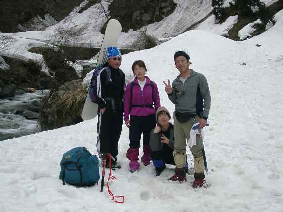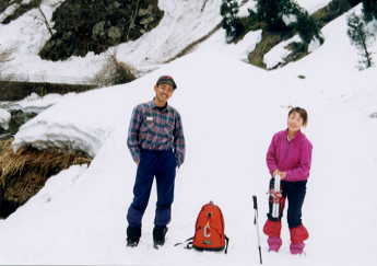 5分間の滞在後、一気に斜面を駆け降りて、先程のグループのいた所に戻ったが、もう姿はなかった。特別急いだわけでもないが、30分程で、スノーボードを楽しんでいると言う別行動のリーダーを除く3名の方々と合流し、行動を同じにした。やや西に振れている行動を東方向に修正し、脆い急斜面を降りて林道に出た。ここで、今日始めて自分の写真のシャッターを切ってもらおうとしたら、サービスとして、可愛い女性が私と一緒にカメラに納まって下さった。車までの長い雪の林道は、疲れが出てしまったのか、何時の間にか、バラバラの行動になってしまった。