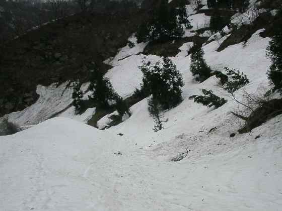 なおも広い尾根が続く。ブナが現れて何となく気持が落ち着くような気がする。初雪山の特徴の一つである頂上直下の大斜面が目に付くようになり、雪面がクラストしているのがわかる。