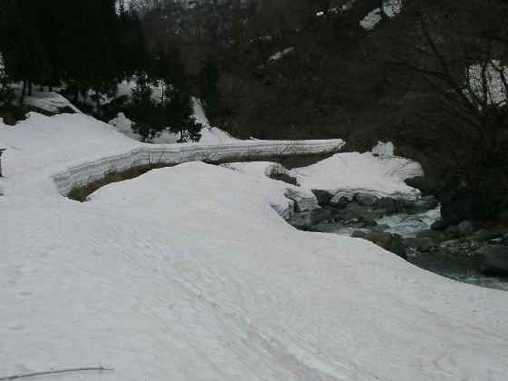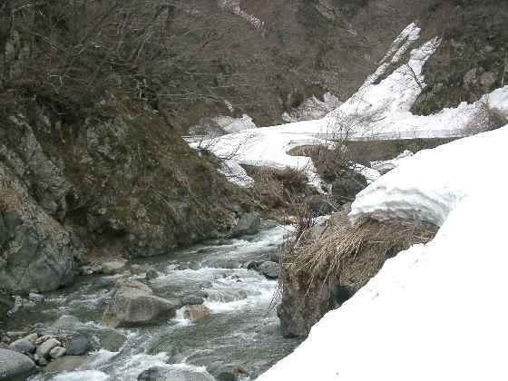 まずは、屈折している大平トンネルが、真っ暗で困惑する。ストックを側壁に付け、等間隔を保ち、もう一本のストックで、路面に障害物がないかを探しながらの歩行となった。やがて光が見えて来たと思うと、トンネルの出口に、デブリが覆い被さった感じになっている。このデブリは、さほどの怖さはなく難なく渡る事が出来る。やがてスノーシェードを潜るが、数年前までは、この場所(以前は、スノーシェードがなかった。)のデブリが一番怖く、橋を渡って右岸に行き、渡渉して、また左岸に戻ったものである。歩き始めから30分余で、境川第三発電所に達し、ぐるっと巻き上げた所の短いトンネルを潜った所から、右斜面上部からの崩落を注意しながら、林道の雪の傾斜も気にしながらの歩行となる。小さなトンネルと小さな橋を過ぎ、右手の沢を過ぎた頃に、3人の釣人を見かけた。その辺は、雪の状態が非常に悪く、川への転落に気を付けながら、歩かなければいけなかった。雪面の足跡が一つになった。