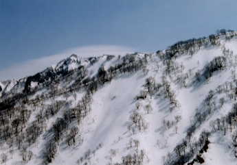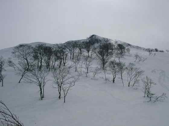 広い斜面の風当たりは益々強くなり、ピッケルを用意した。クラストした雪面に、トレースは、雪煙と共に今にも消えそうであった。山スキーの青年が、上から滑り込んで来た。