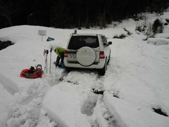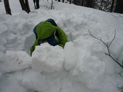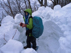 それでもである。3時間を経過し、「山ノ神」が、例の如く、「あんただけ、行って来られ!」 となる。と言われても、放って行くわけにもいかない。ずぶ濡れだし、これが限界かと思った。すぐ、引き返す手もあったが、「何か食べたい。暖まりたい。」 の他に、ちょっとでも、山にいたいと思う心が働くのか、穴を掘ることにした。