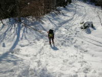二上山頂上に登ってから、反対側から再び万葉ラインに降り、しばらく歩いてレストラン横から大師ヶ岳に取付く。ここからはトレースがなかった。不覚にもやや西側の斜面を降りようとしてしまった。竹林が東に見えて間違った事を感じていたが、何とかなるだろうと思いながら降ったのがいけなかった。後続の二人にその旨を伝えたら、戻って正規のルートに戻られたらしい。