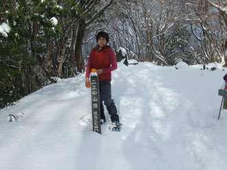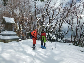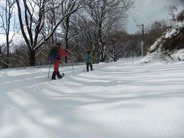 そんな我らは、「少しでも歩きたい。」 と、スノーシューデビューを兼ねて、二上万葉ライン伏木地区八十八箇所からのスタートとなった。積雪は、思ったより少なく30~40cm程度で、ラッセルに苦労する事はなかった。