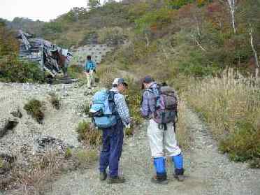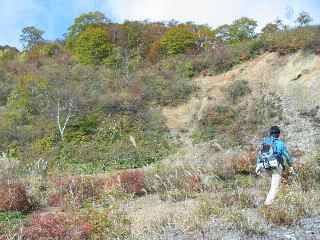 逆方面になるが、しっかりした道があったのでそれを辿ったが、予測どおり先程行った鉱滓の小山の崩壊地のような反対斜面に出てしまった。