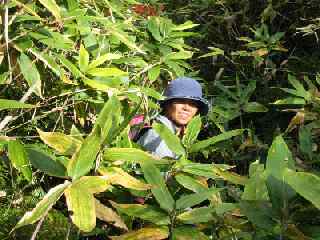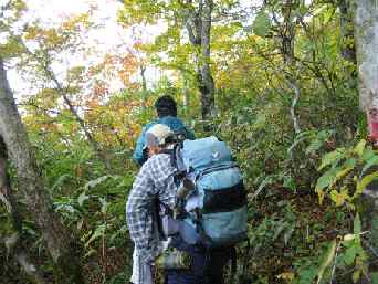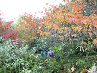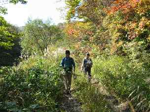 30分程の僅かな時間だったが、山頂を後にする時、その山頂の先に、踏み跡が続いていたが、何処へどのように続いているか分からないので、先程の白いテープの所へ戻ったのが、間違いだったのかもしれない。道ではなくヤブの連続で、くぼんだ歩き易い所をコンパスを見ながら、時には、高い所に登って確かめたりしながら、下ったが、清五郎小屋の横に出たのは、白いテープから40分も要してしまった。 “ 可笑しいな~。” 地形図を見ながら、車のデボ地点に戻った。