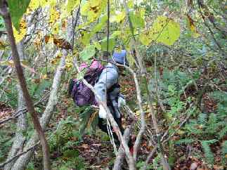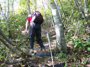 何処かに道があるかもしれないし、また、初心に戻るために、小屋の前に戻る事にした。その頂上の方向に、向かってのルートを模索したが、完全なヤブのために諦めてしまった。小屋の上部から取付いたが、手前からだとは思っても見なかった。