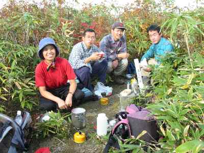 視界の利かない尾根を、モクモクと歩くしかない。“ 宴会のする時間がなくなるよ!” などと声を掛けるが、「山ノ神」は、小腹が空いてピッチが上がらない。1370㍍のピークから視界が開けるが、霞んで見通しが良くない。でも、先程登って来た池ノ山や高幡山、横岳が大きく見えて来る。小さなアップダウンを繰り返し一等三角点のある六谷山頂上に着く。その奥には大きな反射板があるが行く必要もなかった。