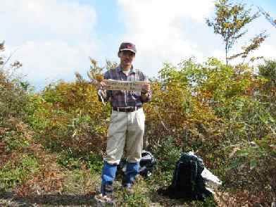 「池ノ山」は、「とやま山歩き」に載っている118座最後の山である。完踏を祝って、同行してくれた「ターさん」、中山君、「山ノ神」としっかり握手を交わした。当初は、池ノ山頂上に立つのは、もっと早い時間を想定していたし、池ノ山は登るに価しない山などの情報があったりして、さぞかし滞在に不向きな雰囲気の所かと想像していたので、展望の良い「六谷山」山頂で祝杯、食事をしようと言う事になっていたのだが、折角の登頂、また何時来れるかわからないからと言う事で、記念に写真を撮りまくった。そして、小さな記念の標識を吊るした。