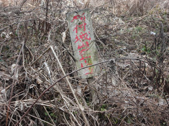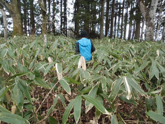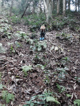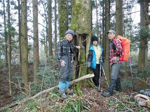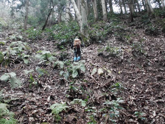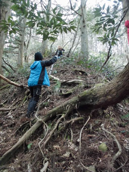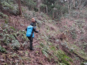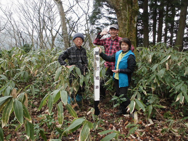 その稲村から城山(348m)に登るのであるが、取り付きが分からない。そこは、池田氏の感が働き、それらしき所を付いて行く。しばらくしたら、マーキングがありそれに従うが、なかなか厄介な踏み跡を辿る事になった。この時期だからかもしれないが、ズルズルと滑るのである。しかし、同氏は、我々の心配をよそに、スイスイいくのであるから、唯々たまげるだけであった。