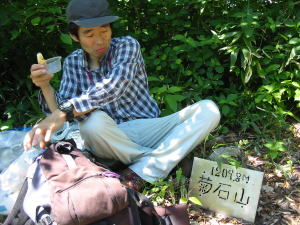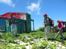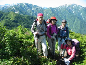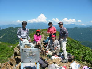 | 犬ヶ岳山頂で記念写真 | 犬ヶ岳こころなごます長旅の 思い出つづるは今日の仲間なり =藤井女史作= |