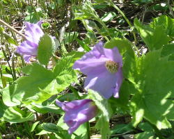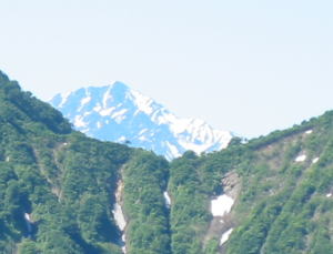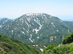 | シラネアオイ | ようやく犬ヶ岳山頂へ | 犬ヶ岳山頂より初雪山を望む | 犬ヶ岳山頂より、 黒岩山・朝日岳方面を望む |
