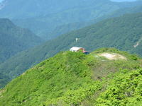 犬ヶ岳山頂から下山開始 | 栂海山荘を見下ろす |