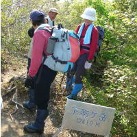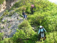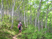 | ちょっとガレた所を行く | ようやく下駒ヶ岳に | 岩場を降りる | 黄連の水場付近のブナ林 |