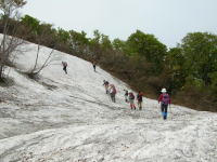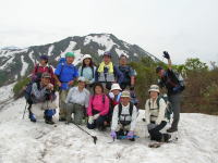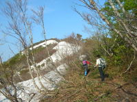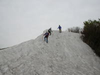 すぐ汗が吹き出るような急登を行く | 山姥の洞の上の人は・・果たして | 今年は残雪が多く雪上を歩く事になる |