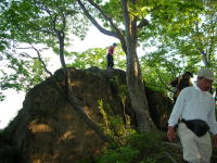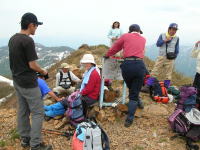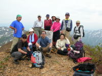 | 犬ヶ岳頂上で遊ぶ | 犬ヶ岳頂上で記念写真 | 犬ヶ岳頂上から 黒岩・朝日岳方面を望む |