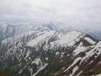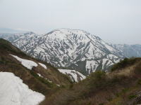 | カタクリの群落③ | 振り返れば栂海山荘 | 犬ヶ岳への稜線 | 犬ヶ岳頂上から初雪山を望む |