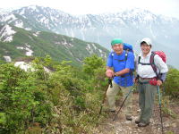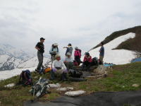 | 栂海新道の重要拠点の栂海山荘 | 栂海山荘横でちょっと休憩 | 急斜面を慎重に下る | 黄連山で犬ヶ岳をバックに記念写真 |