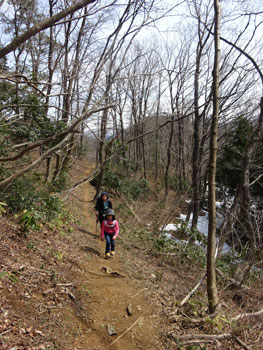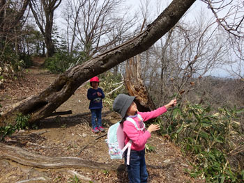 4/3 車中での予報は、「お昼過ぎから雨。その後も・・」 ちょっと困ったが、そんな事もないだろうと、予定より30分遅い西種(水上)を午前9時のスタートとなった。二人の孫共、ちょっと大きめの靴(エリーは、ミーのお下がり)で、行く手に少々の不安があったが、孫達の急成長にちょっぴり驚いた。