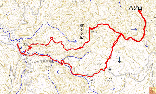 | 今回のルート。 大岩→城ヶ平山→分岐→ハゲ山→分岐→浅生→大岩 |