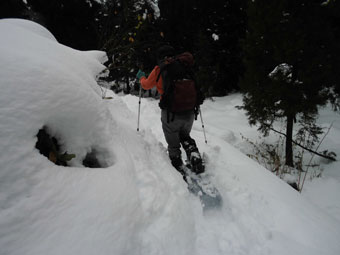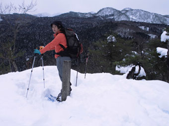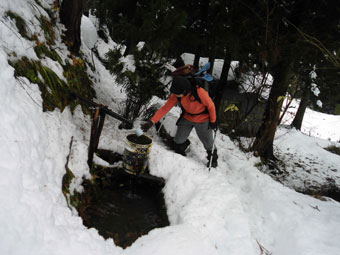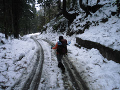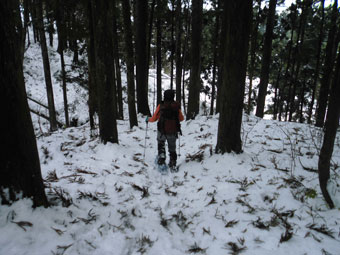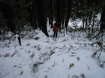 | 水があると、必ずといっていいくらい山ノ神は飲む。 | 杉林を行く。 |