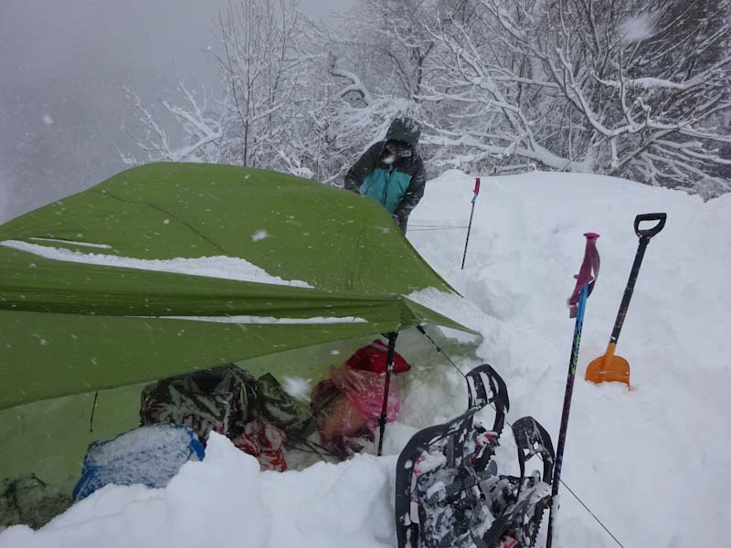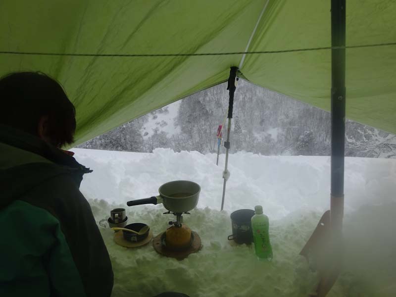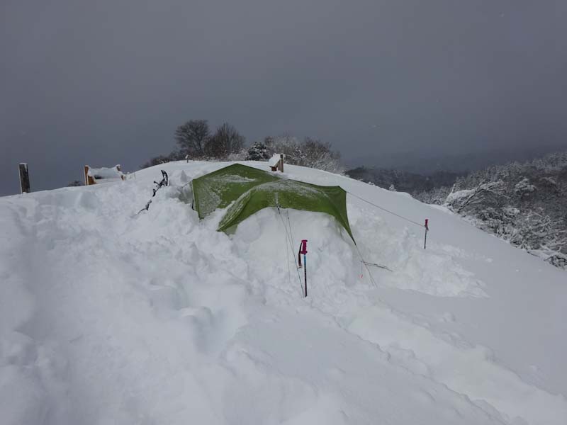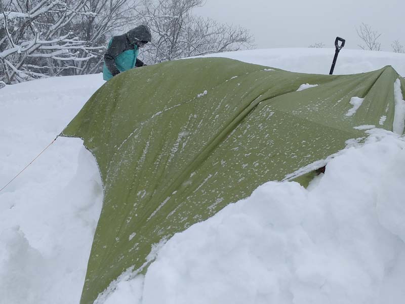 雪を掻き集めて雪壁を造り、タープを張った感じです。
