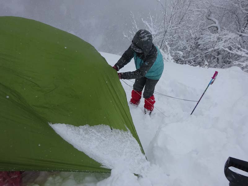積雪は20~40cm。樹木がないし、雪質はサラサラで固まらない。雪壁を造るのはかなり難しかった。でもやるしかない。高さが出ないのが一番難しい。
