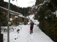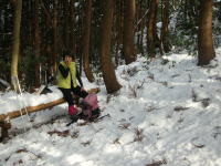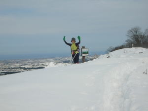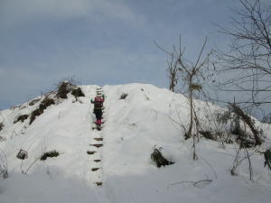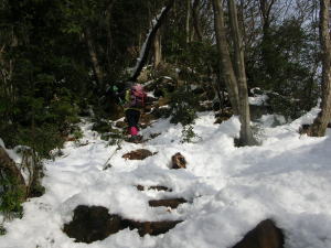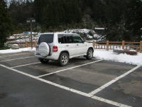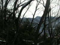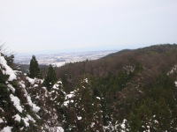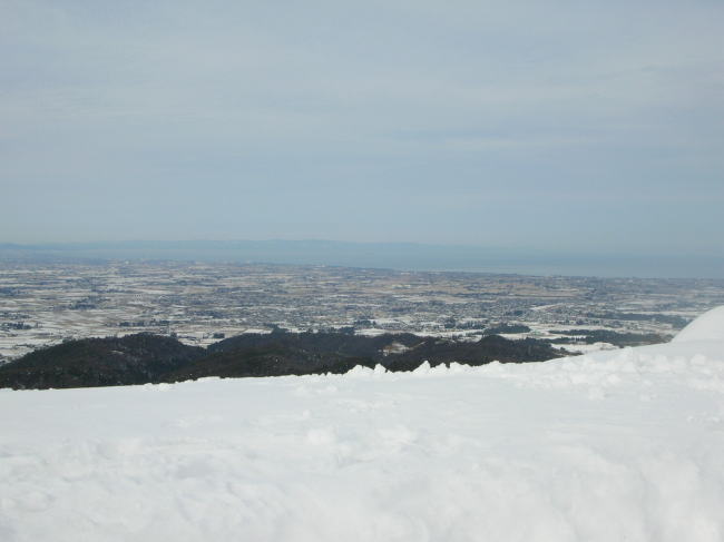 | 車は、この駐車場に・・ | 登り始めてすぐ雪が・・ | 樹木の下には雪がない | すぐ開けて、平野と海が・・ |