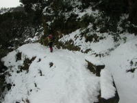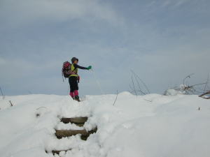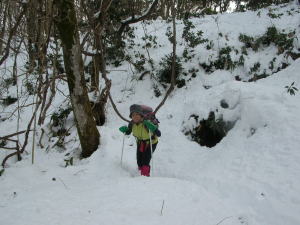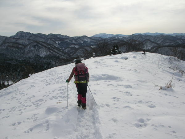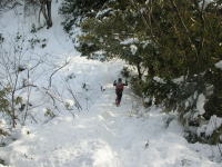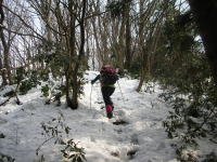 | 「鍋冠か? 高峰か?」 | 「あれが、城ヶ平山頂だ!」 | ようやく、びっしり雪が・・ | もう一登りすれば・・ |