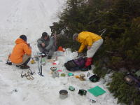 山頂直下で、雪のテーブルなしの食事 |