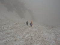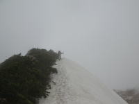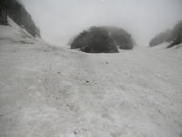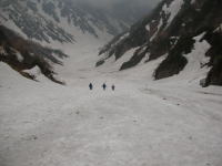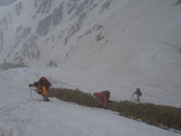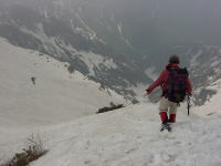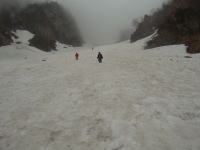 食事が終わらないうちに、雨が落ちて来たと思いきや雷鳴が轟いた。イヤな感じである。早々に片付け下山となる。こうなると、先の鞍部から、左俣を下る事になったが、最初は激しくはないが藪を漕がなければならない。ヤブを抜けた所でアイゼン装着し、一目散に下った。最初は急で恐る恐るの下降となったが、しばらくして、慣れればどーって事はない。