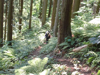 つづら折りに杉林を行く。