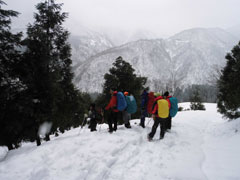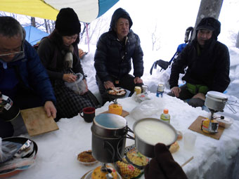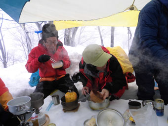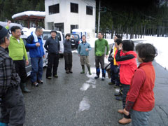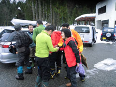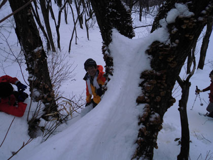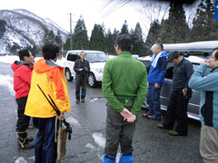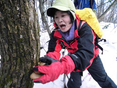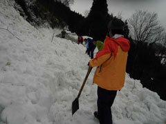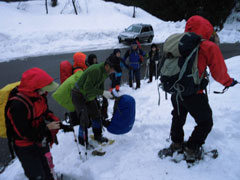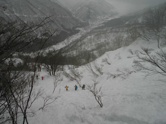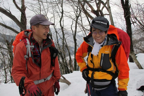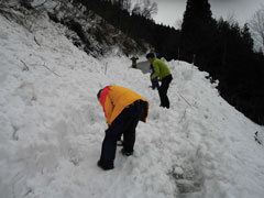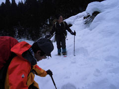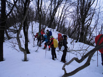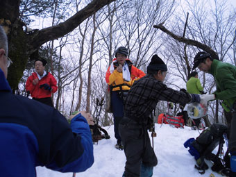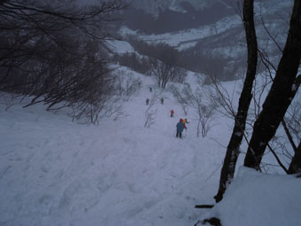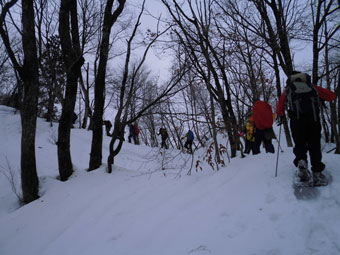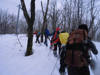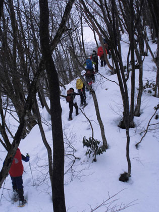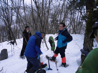 | 後続を気遣う仲間達。 | 急斜面も何のその。 | 林道に出て、次は何処へと思案。 |