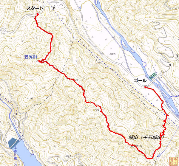 | 今回のルート。折戸の登山口~笠尻山~千石城山~剱橋詰 |