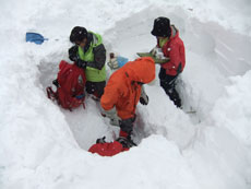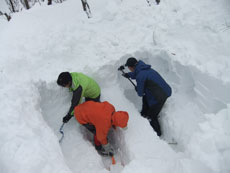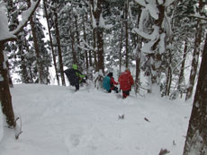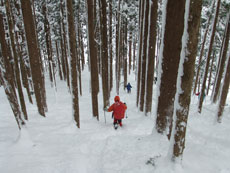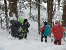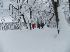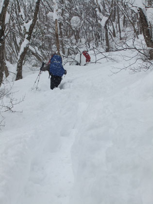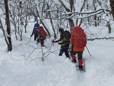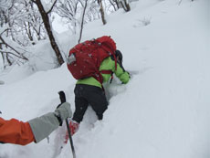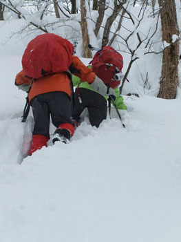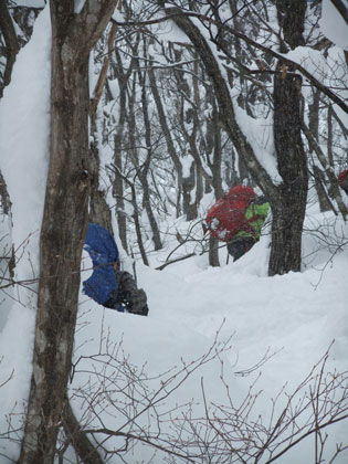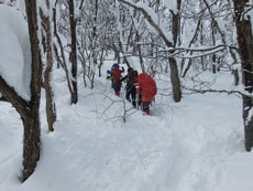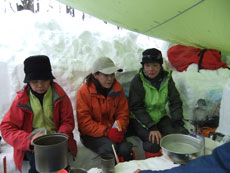 しかし、そのピークは果てしなく遠くに感じ、最低鞍部に達した地点で引き返す事になる。(ここまで偵察と無理矢理納得させて・・・) 山頂付近まで戻り設営となったが、今期初めてのタープを張る事で、降雪を凌ぎ、また暖かさを感じた。久し振りの純粋好山病メンバーでの山行であったが、「たまにはいいね。」 と言いながら、一気に車デボ地点に戻った。30分も掛からなかったのではなかろうか・・・