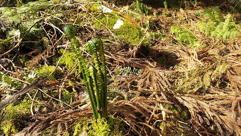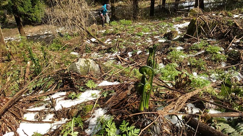 前週は、フキノトウを山ほど採ったが、今回は一週間経っているので、かなり伸びているのと、今回の目的はコゴミであったから、ずっと我慢をしての歩きであった。前週は、この林道にかなりの残雪が覆っていたが溶けて少なくなったのと、第3発電所辺りでは、重機が雪を払い除けた跡があった。