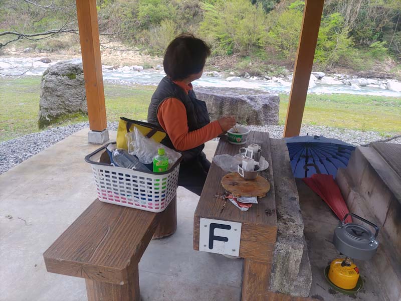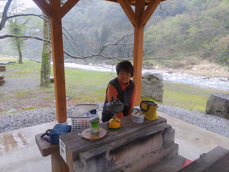雨が降って来たので、まだ開場前の片貝山ノ守キャンプ場で簡単な食事をした。