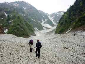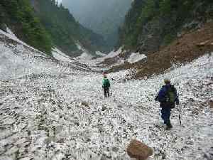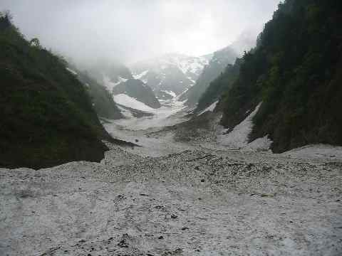 大きく雪渓が裂けている所を左岸寄りにトラバースして、春の終焉を物語るデコボコで薄汚い雪渓に駆け上がれば、あとはそう危険な所はない。阿部木谷が毛勝谷に名を変えるのは、板菱からなのだろうか、それとも板菱を過ぎてからなのだろうかわからないが、30分も行くと大明神沢出合に達する。
