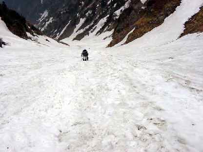 大明神沢出合から左折した感じでその雪渓は広くなり、だんだんと高度を上げて行く。さほど勾配を感じないが、振り返ると随分高度を稼いでいる。土石で汚れた右の谷もはっきりと見え、三つの谷が合流する所が三ノ又である。標高1550~1600㍍であろうか?この先800㍍の急斜面を登るのであるが、岩や雪魂の崩落だけが心配である。