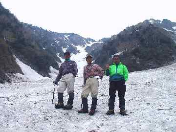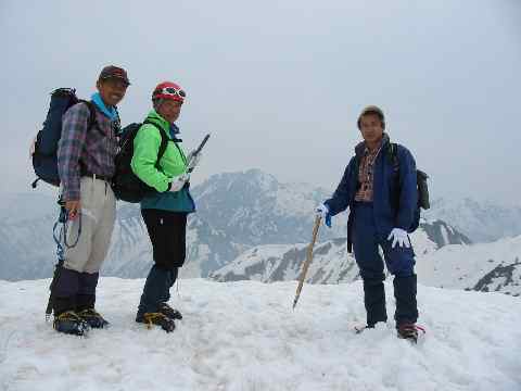 どちらが本谷かわからないくらいで、初めてこの谷に入ったり、ガスに迷わされると、まっすぐ大明神沢に入ってしまう恐れがある。3人しかいない不気味なくらいに静かな谷は、デブリのために、恐竜の背のような茶けてデコボコした雪渓である。昨年は、この地点を通過する時、2頭のカモシカが、デブリにやられて横たわっていた事を思い出した。私のGPSの大先生でもある二人は何やら衛星を受信する感度が悪いと言っている。私は、あまり詳しくないので、ニヤニヤしているしかない。