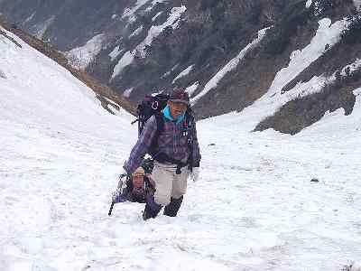 ゆっくり楽しみながらの今日のテーマ通り、15~20分間隔で休息を入れ、単独行や早駆けでは有りえない写真を惜しみなく撮る事にした。上部からの崩落を気にしながら、ポーズのリクエストまであるおおよそ緊張感が走らなかった。中でも初めてピッケルを使うという北ちゃんが、傾斜や高度が気にならず、恐怖感がないという。デジタルカメラ使用で、なかなか高度感を出せないという話題が出ていただけに、北ちゃんの目も、そのデジタル仕様ではないのかと、盛んにからかってみた。