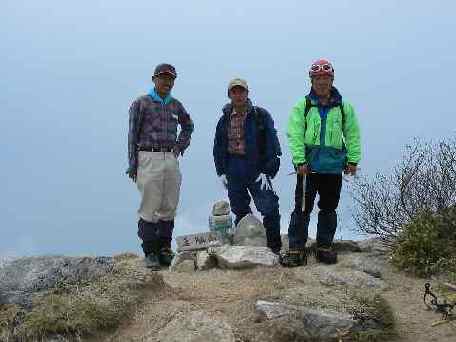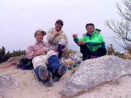 その優等生達の中で、逆に“今日だけは飲んでもいいかな!” と缶ビール一人1本分の計3本を冷凍して持って来ていた私だったが、イザ乾杯のために栓を開けたらまだ凍ったままで、無常にも泡だけが吹き出してしまい大笑いになった。“雨が降らないうちに、ガスが掛からないうちに、思うように写真を撮っておかなくちゃ~!” と言いながら、熱く語る「山の話」に立ち上がるはずがなかった。そのうち、北ちゃんが、39度の熱を出している「かーちゃん」をほったらかし来たと言うし、シュンちゃんは、仕事を休んで来たと言う。私は、「山ノ神」を他の山に追いやって来たと、山バカ達は家に帰れば、それに対しての仕打が待っている事を忘れて盛り上がった。僅かなアルコールでも、「山」を肴にすれば、あ~っと言う間に時間が流れた。