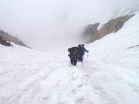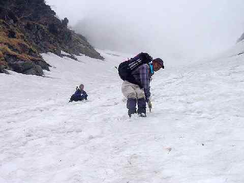 下り始めは少し緊張するが、腐った雪だけに、踵から蹴り込めば、そうそう「ずる~」と行く事もない。ガスの覆われた急斜面に立ち止まって、お互いデジカメでパチリパチリ。もう張詰めた緊張感など何処かに飛んで行ってしまい、グリセード(あまり滑らない)、尻セード、走り出すなど思い思いの動作であっと言う間に三ノ又に着いてしまった。その先を急いだが、すぐ大明神沢で合いに着いてしまったが、GPSの緯度経度そして高度も違い、往路の時からの受信が可笑しいと嘆いていたが、その先に再び本当の大明神沢出合が現れ、視界が悪く何も見えなかったとは言え、あそこは何処だったのだと反省しきりだった。