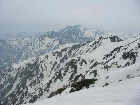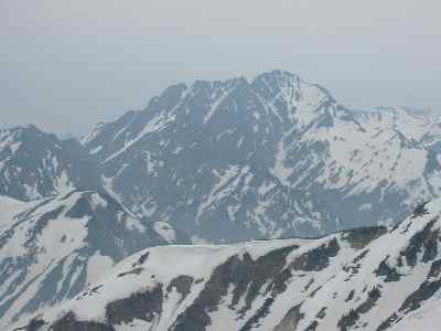 小さな尾根で本谷とボーサマ谷に分かれて、益々急傾斜になるが、デジタル眼の北ちゃんが、今月上旬に「あらちゃん」が通らなかったルート(本谷)を希望したが、シュンちゃんとなだめすかして、通常のボーサマ谷を行く。“「ハイマツ」が見えたら鞍部だよ!”と言っておきながら、なかなか到達しない。でも、振り返ると、僧ヶ岳に続いて駒ヶ岳が良い感じで浮かび上がって来ている。“雨が落ちないうちに頂上に行きたいね。” 一歩一歩確実に足を前に送り出しておれば、息が上がろうとも高度を上げて行く。三ノ又から2時間を要して鞍部に出た。ハイマツを越えれば、曇りがちのお天気であっても頗る展望は良く、やっぱり「オッー」と声をあげてしまった。剱岳や後立山連峰の山々に、吸い込まれるようにカメラのシャッターを切り続けてしまうのである。お腹がすいたから、とりあえず山頂に行ってメシにしようと最後の力を振り絞った。