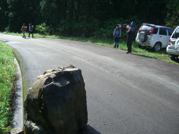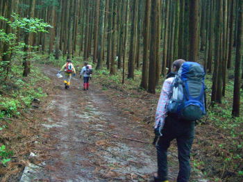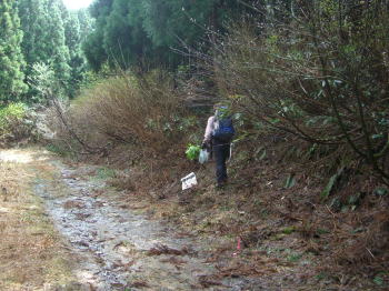 | 登山口のず~っと手前に駐車 | 杉林沿いに歩く。時には、その中へ | 1時間20分後に、ようやく登山口へ |