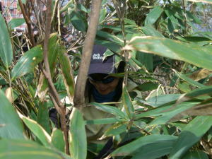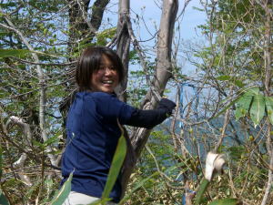 | キラズ山の三等三角点 | 高いところに登りたがるマキちゃん | 展望を求めてヤブを漕ぐねぎちゃん |
