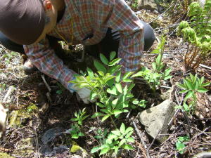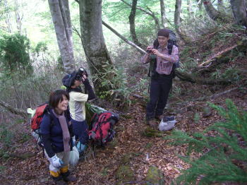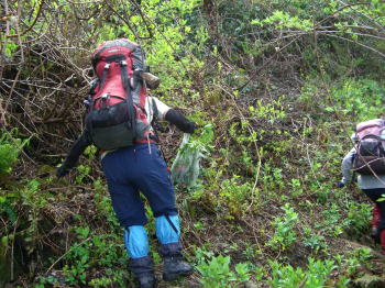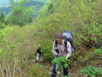 | 北ちゃん、天ぷら用にウドをゲット! | 雨上がりで岩の上は滑りやすい | どちらの踏み跡を行くか思案中! |