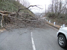 | 和佐府橋のゲートを突破して、5キロほど 進んだが、倒木が道を覆い車もここまで。 |