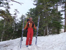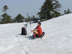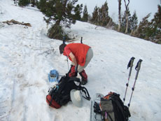 a.m.6:40 早くも休息を催促された。 | a.m.6:54 壺足でも行ける状態であったが、 スノーシューの重さを考えると履く事にした |