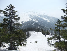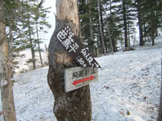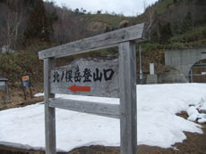 残雪がある林道には40〜50台の車が駐車。 a.m.5:55 登山口に向かって歩き出す。 |