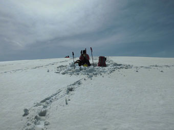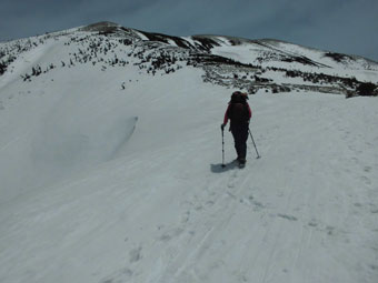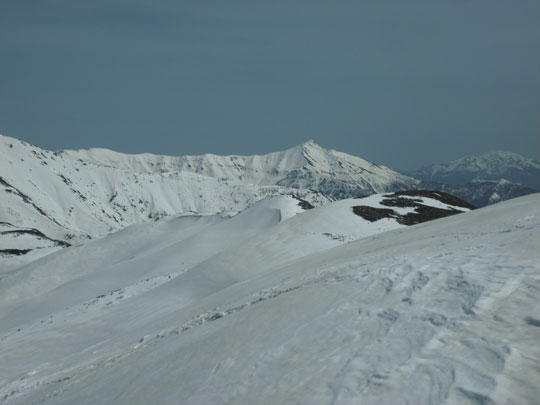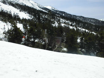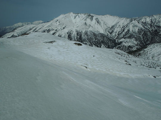 しかし、北ノ俣岳真っ白であった。少雪と高温を想定していただけに、ピッケルを持参しなかったのを悔いた。でも、時間が時間だけに、「雪は緩む。」との確信はあった。その雪は、前日の降雪によるもので、量自体少なく、すぐ下は、ハイマツが、今にも顔を出しそうな所が多かった。